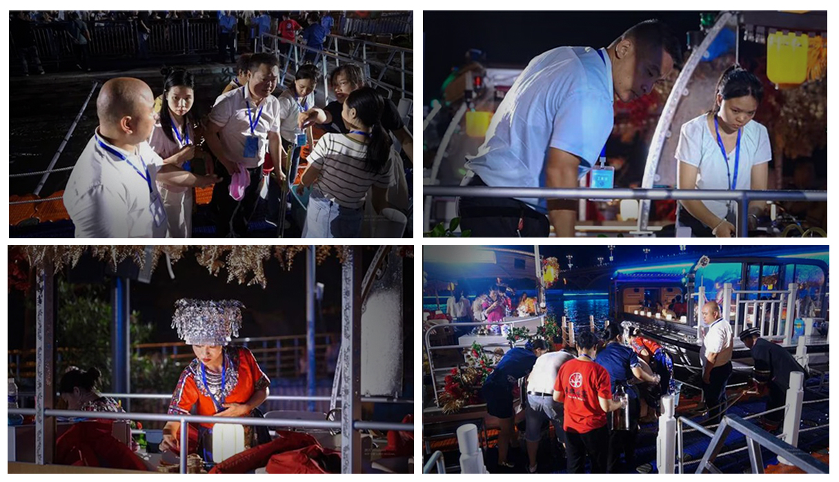 在項目建設過程中,運營團隊立足長遠,明確了可持續發展的方向和目標。為了確保演出的恢弘和震撼,導演組在迎親環節需配備8艘船8名船夫,在大秀演出上需配備幾十名演員,運營團隊經過綜合評估,科學測量,提出了將兩艘船捆綁,4名船夫駕駛的方案,以及演員“全職+兼職”的模式,達到人員的最優配比,減低運營成本,為項目的可持續化運營奠定了基礎。