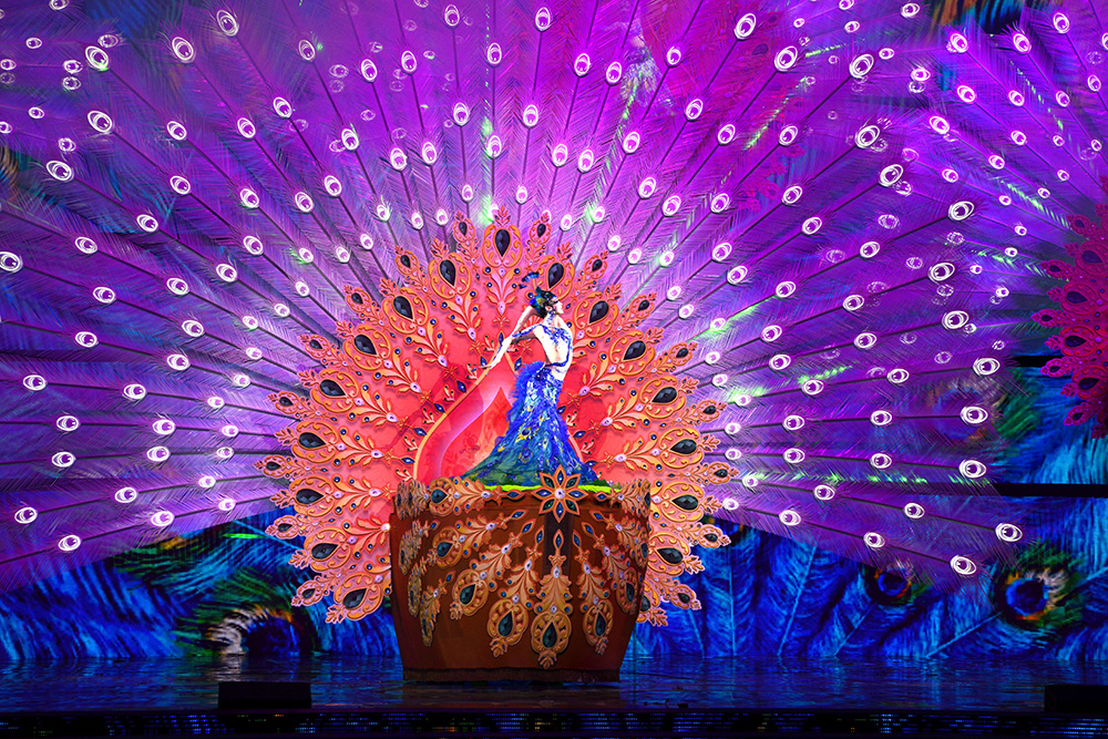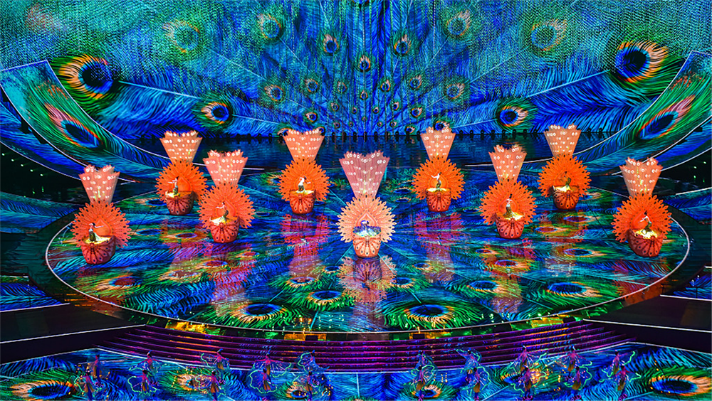 機器孔雀、巨型“扇陣”、舞臺表演跑馬機等高科技舞臺裝置,通過藝術與技術的完美融合,為多姿多彩的亞洲風情大聯歡增添了別樣的光彩